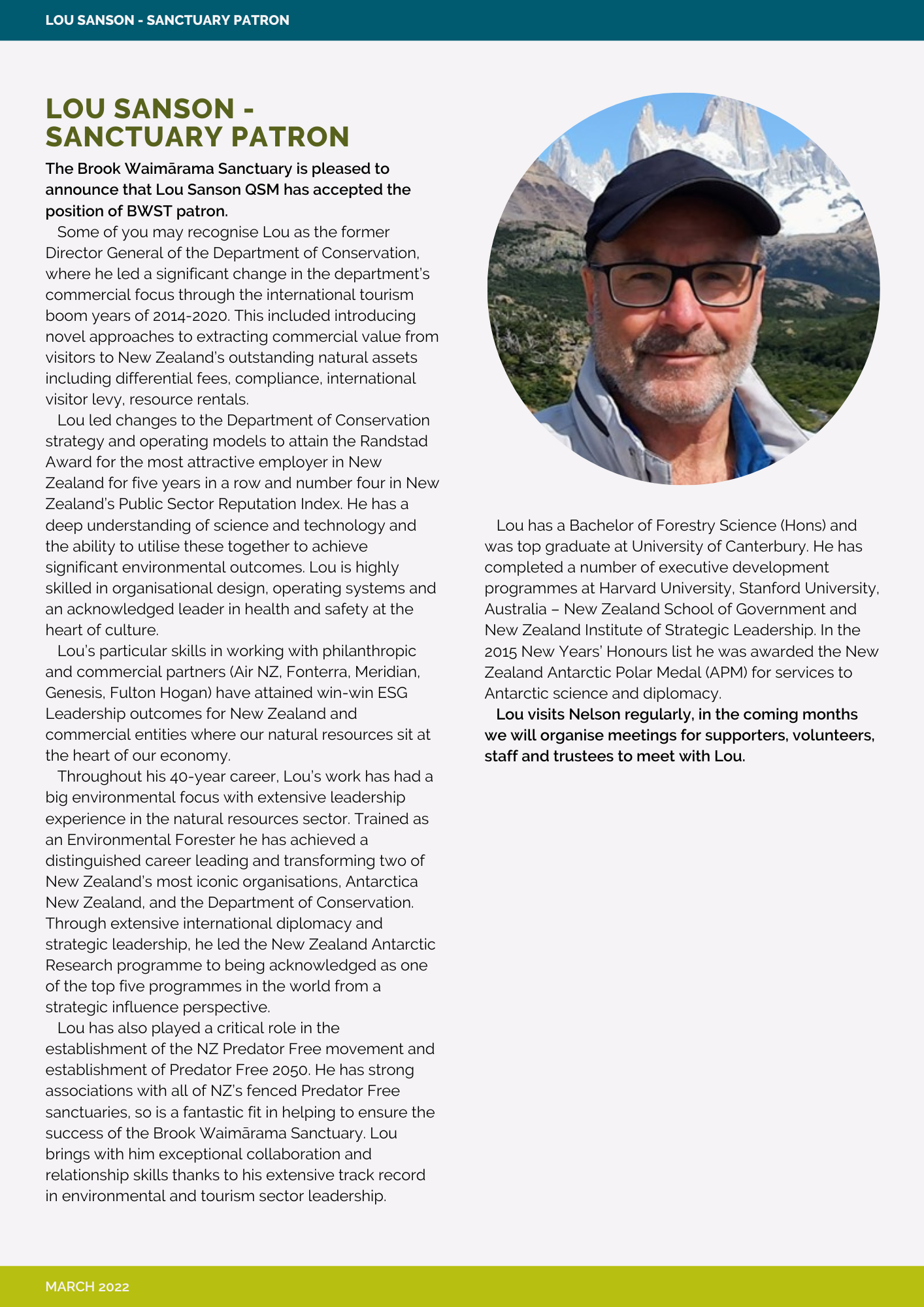 The Brook Waimarama Sanctuary Trust Patron is Lou Sanson QSM. Lou is the former Director General of the Department of Conservation, his appointment as Patron was announced in March 2022. Lou attended and spoke at the Trust’s AGM in October 2022; Lou visits Nelson on a regular basis and takes a keen and active interest in the Sanctuary. You can read more about Lou’s career by clicking on the image on the right.