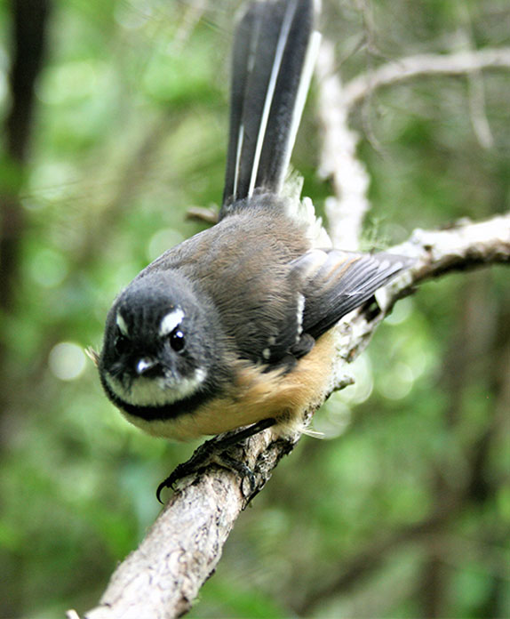 Fantails belong to the genus Rhipidura, found throughout Southeast Asia and the Antipodes. New Zealand has one species, Rhipidura fuliginosa, with four subspecies: the North Island fantail, the South Island fantail (Rhipidura fuliginosa fuliginosa), the Chatham Island fantail, and the extinct Lord Howe Island fantail. The South Island birds are slightly darker — the name fuliginosa means “sooty.” Black fantails are not a separate subspecies but a colour variation, found most often in the South Island where they make up about 5% of the population.