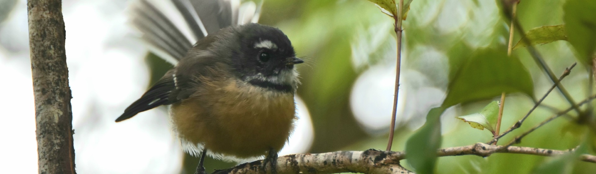 Pīwakawaka are widespread in both native and exotic forests, scrublands, orchards, and urban gardens. They do not cope well with cold winters and are uncommon in areas with snow or severe frost. South Island fantails typically live for only 1–2 years, compared to 5 years for North Island birds and up to 15 years for Australia’s willy wagtails. Nesting adults, eggs, and chicks are vulnerable to predation, especially from ship rats which can climb to their nests.